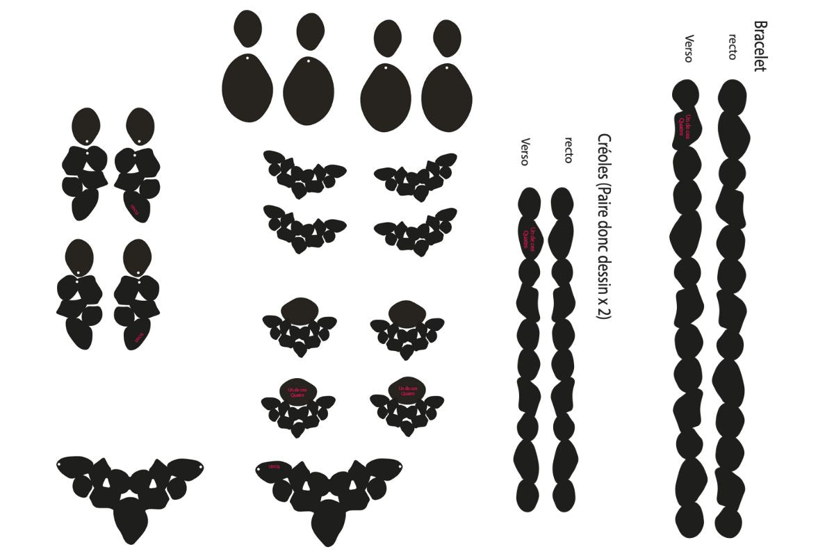 Les dessins sont ensuite imprimés sur papier à taille réelle . Ces prototypes de papiers permettent à la créatrice de se rendre compte des dimensions de la pièce et de repreciser ses dessins si besoin. Puis un prototype en laiton est réalisé. C'est a ce moment là que Florence concrétise le bijou, définition des textures, assemblage des pièces, soudures ... Un premier exemplaire de la collection voit le jour !