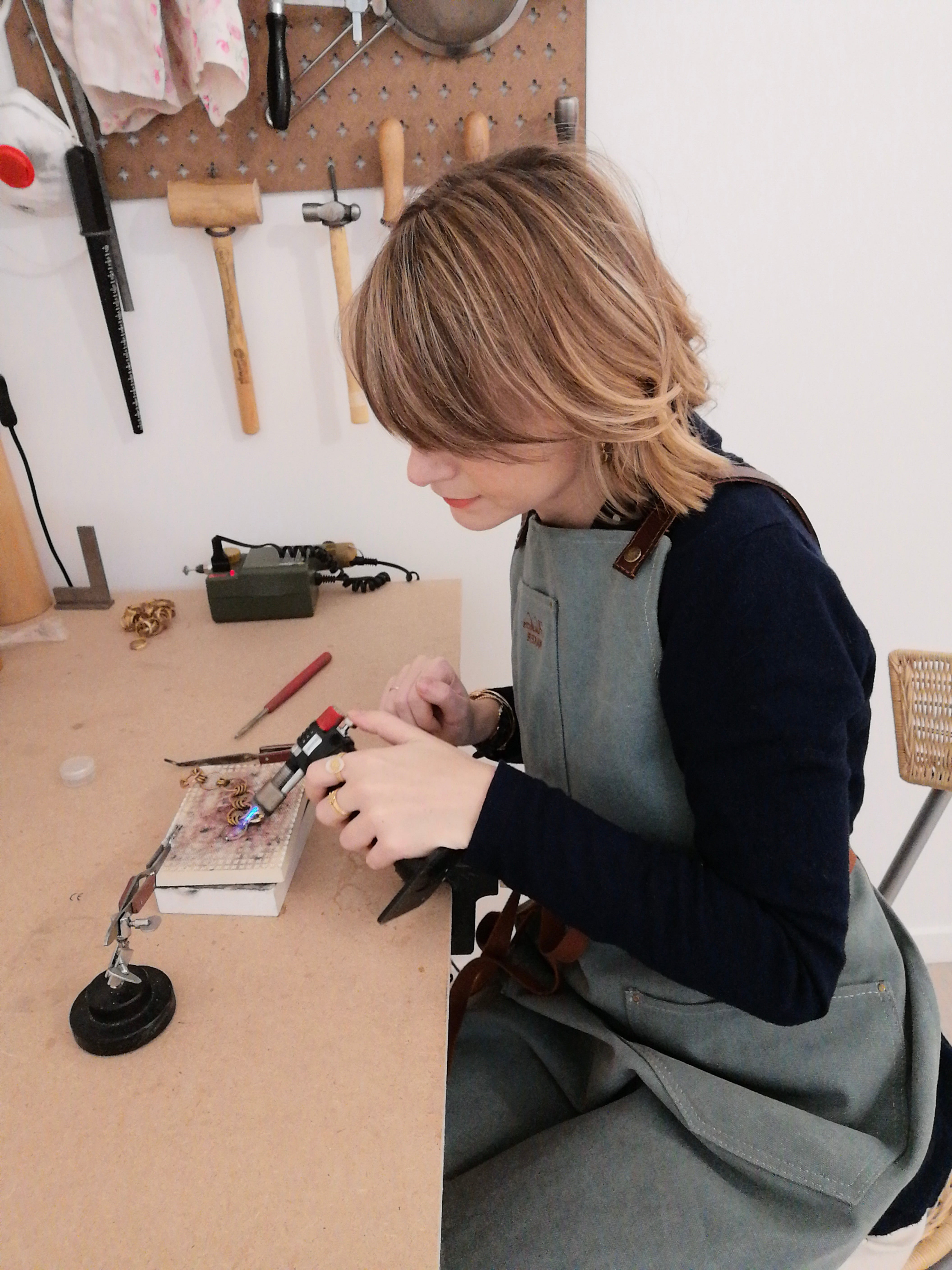 Elle pose alors ses valises à Nantes et commence à se former en autodidacte à la bijouterie. Au bout d'un an à se consacrer quotidiennement à l'apprentissage de ces techniques ancestrales, et après une longue quête pour la recherche d'un doreur, Florence lance en 2019 sa première collection de bijoux fabriqués artisanalement de A à Z. Sa bague Hélios est d'ailleurs un modèle iconique issu de cette première collection.