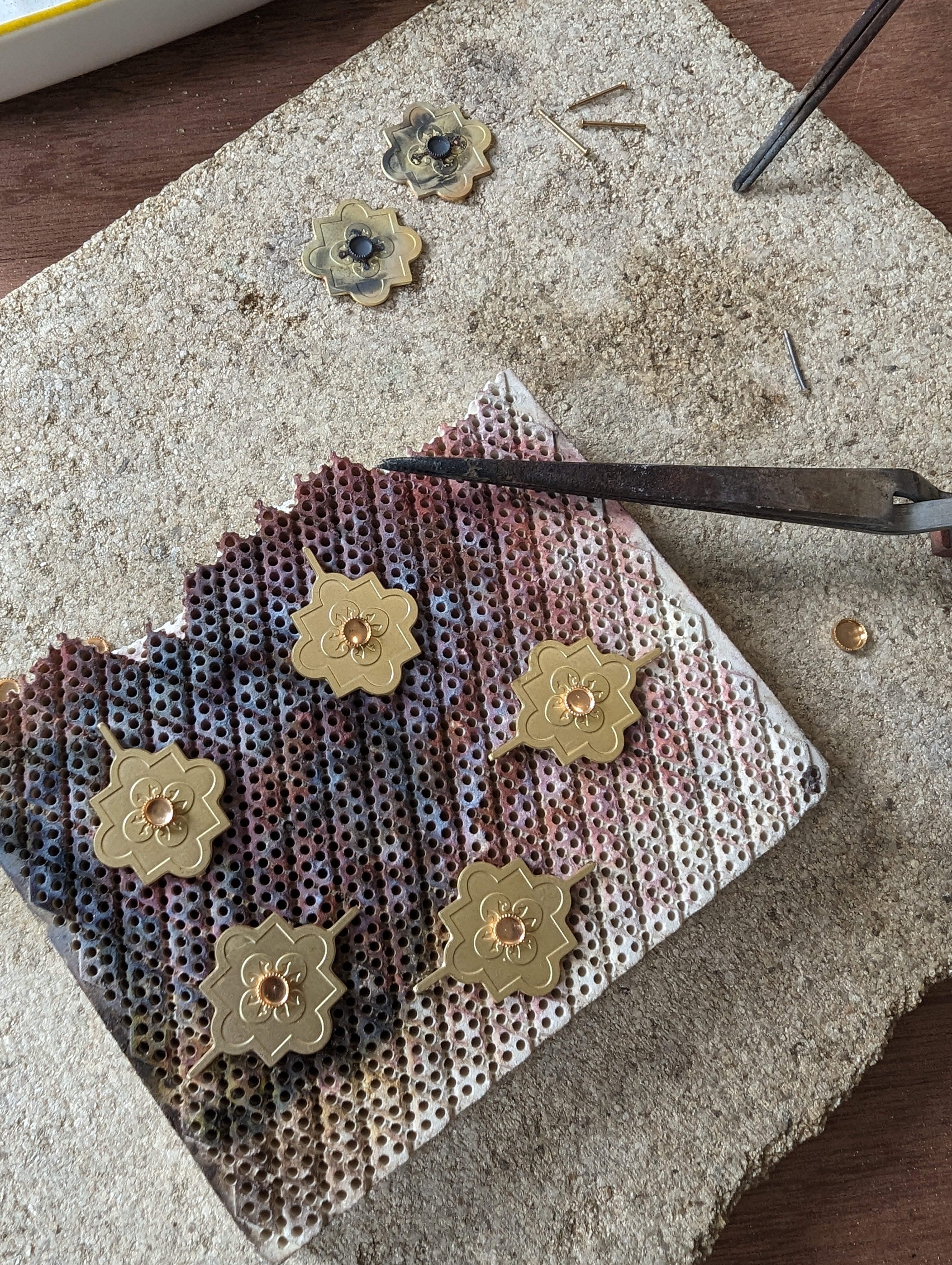 Nous y ajoutons les pierres, ou colorons les bijoux avec notre résine époxy (“émaillage à froid” ). Nous assemblons les colliers et bracelets : ajouts des pendentifs sur les chaines, enfilage de perles etc...